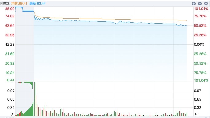 瑞立科密方面,本日上市开盘高涨88.74%,截止上昼收盘涨幅回落至58.47%,半日成交量1806.13万股,成交额12.81亿元,换手率44.46%。截止发稿,该股股价最高波及79.8元/股,若以此计较,单签盈利约1.88万元。