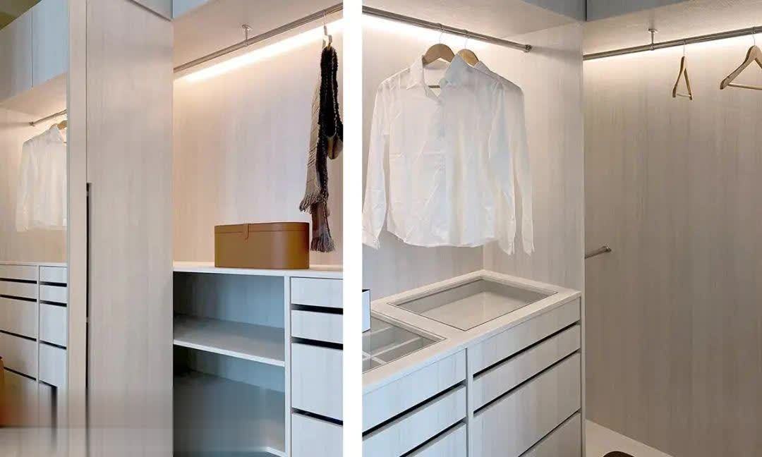 衣帽间打算得超等棒,少量空间齐莫得奢侈。顶上的大柜子用来存放换季被子等大件物品,底下作念足了抽屉等收纳空间。