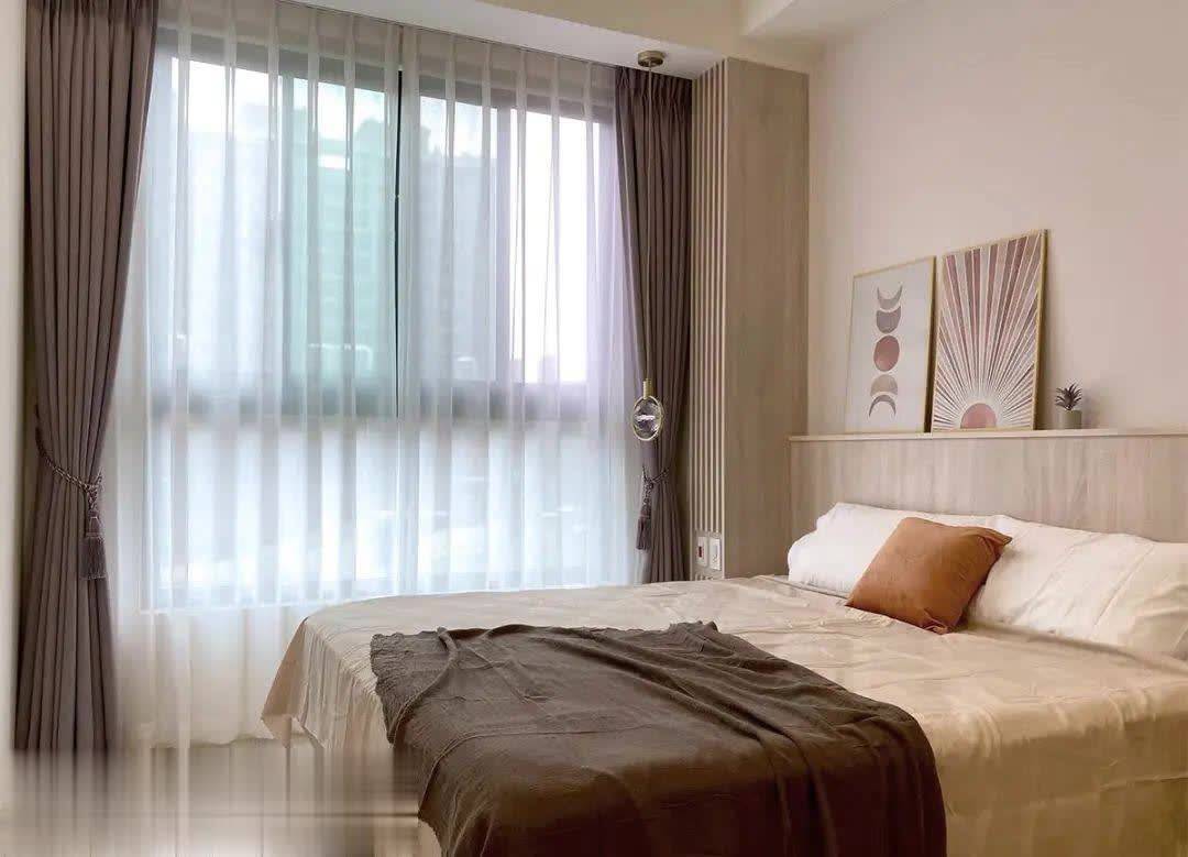 主卧顶住得高出温馨,略深的床头板上可摆末端机或小版画覆盖。