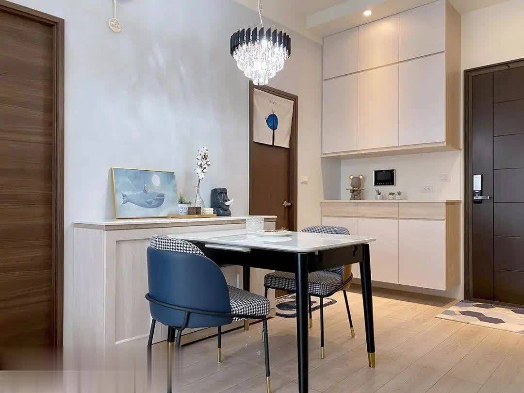 进门右手边等于用餐区域,固然才戋戋几个闲居,不外一应俱全,半高的餐边柜上头合乎摆些覆盖品,底下柜子收纳功能不小。