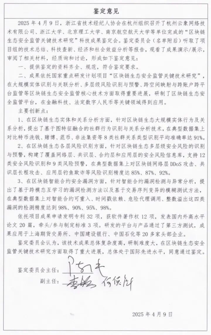 本案例的接头样子“要道规模定约区块链基础圭表中枢时刻与应用”截至物获取中国电子学会科技朝上二等奖:2023年9月18日,中国电子学会组织召开了截至强劲会,中国工程院院士陈纯(区块链与数据安全寰球要点实验室主任)为强劲委员会主任、中国科学院院士朱中梁为副主任。强劲委员会觉得,该截至时刻复杂度高,研制难度大,更动性强,样子截至举座达到国外先进水平,其中智能合约杜撰机硬件加快、智能合约破绽检测处于国外泉源水平。强劲委员会原意“要道规模定约区块链基础圭表中枢时刻与应用”样子截至通过科技截至强劲,最终获取中国电子学会科技朝上二等奖。